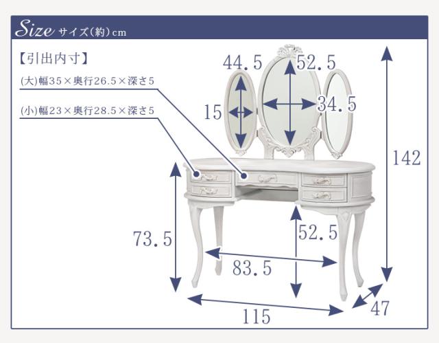 | ■サイズ(約) | 幅115×奥行47×高さ142cm [天板の高さ73.5cm] [引出し(大)]幅35×奥行26.5×高さ5cm [引出し(小)]幅23×奥行28.5×高さ5cm |