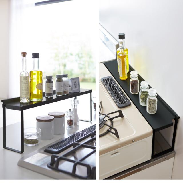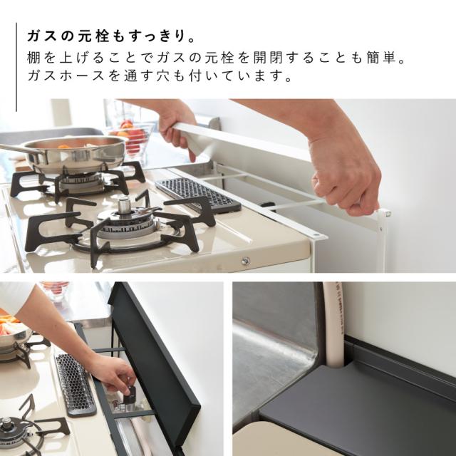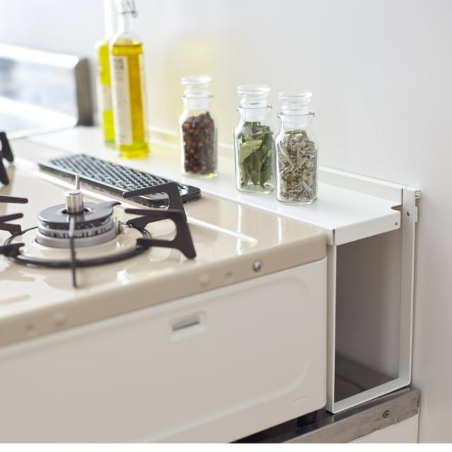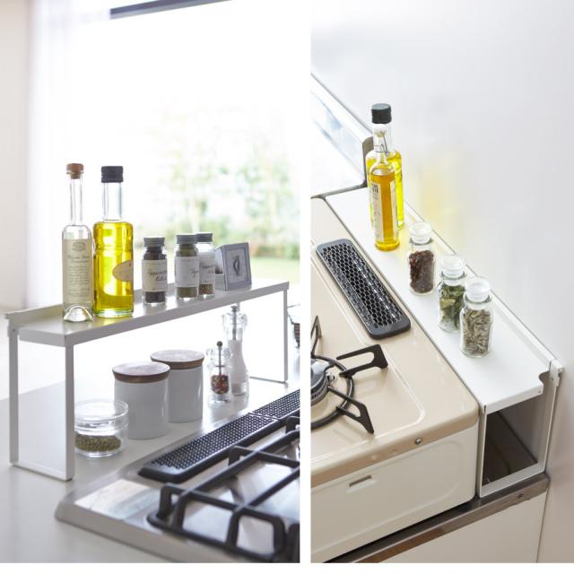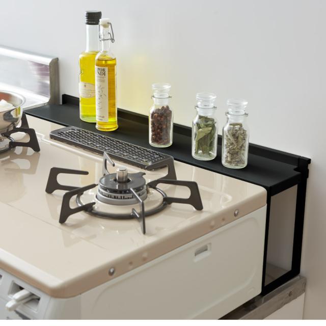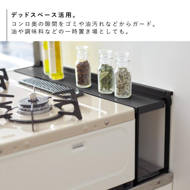 汚れが気になるガスコンロの奥のデッドスペースに!油ハネや食材やゴミ等の汚れから守り、スペースを有効活用してくれるラックです。ガスコンロ奥の隙間を、ゴミや油汚れなどからしっかりガード。油や調味料、キッチン小物の一時置き場としても使用できます。