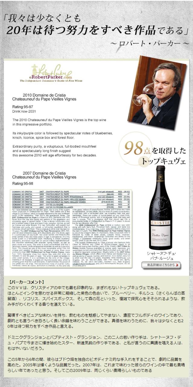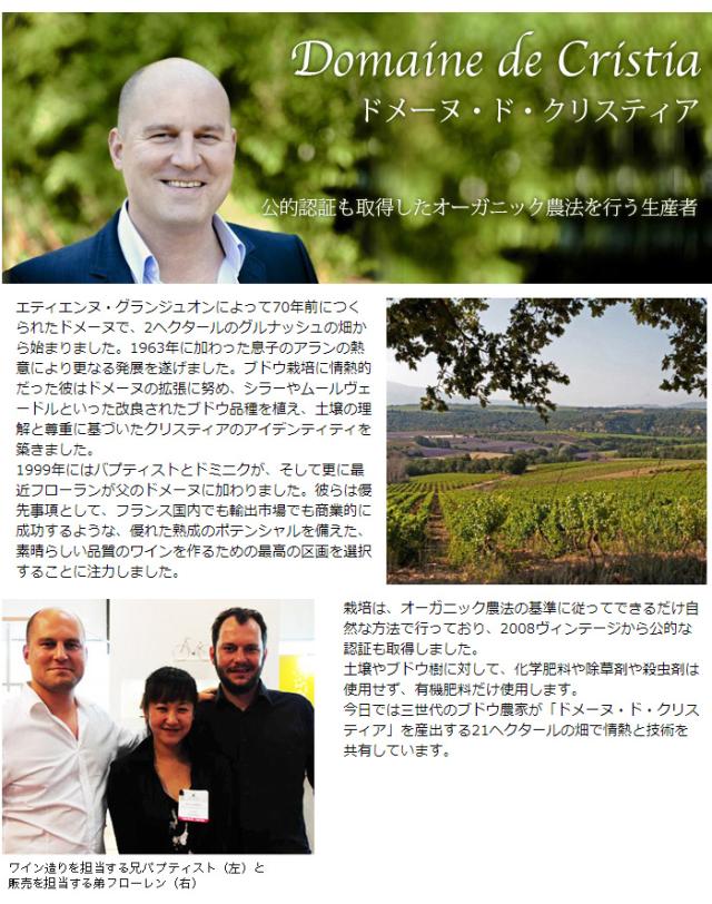 クリスティアでの主要なブドウ品種はグルナッシュであり、全てのアペラシオンのほぼ85%に達します。この樹勢が強く繁殖力のある品種は、強風や旱魃に対する抵抗力に秀でており、プロヴァンスの気候にとても適したもので、黒果実、キルシュ、カシス、獣肉のアロマを与えます。