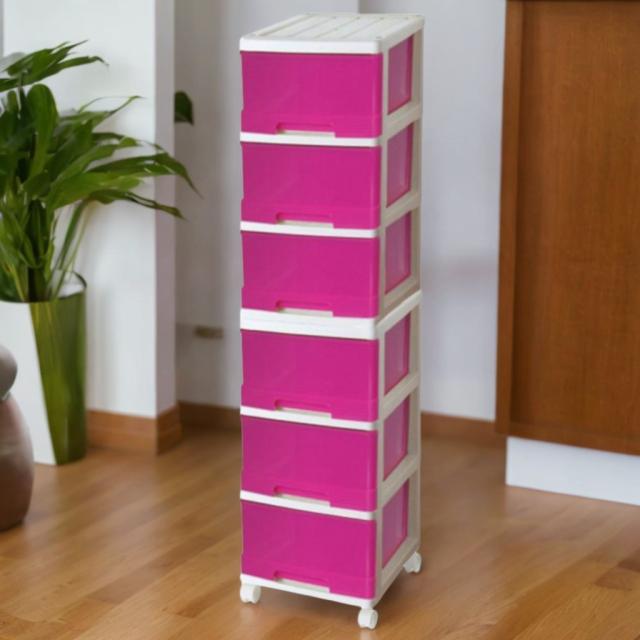 収納ケースの引き出しは収納品が見えにくい見た目もお洒落なピンク色です。