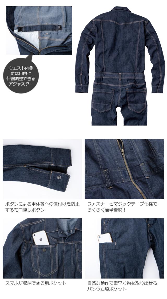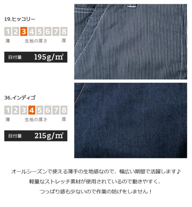 | 素材 | デニム:綿73%・ポリエステル24%・ポリウレタン3% ヒッコリー:綿65%・ポリエステル33%・ポリウレタン2% | ||||||
