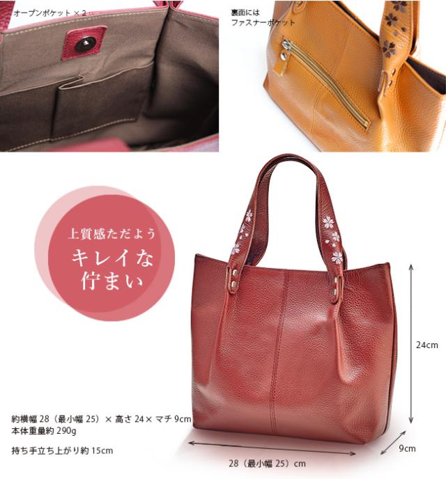 花の刺繍と立体的なハンドルが女性らしい牛革トートバッグです。