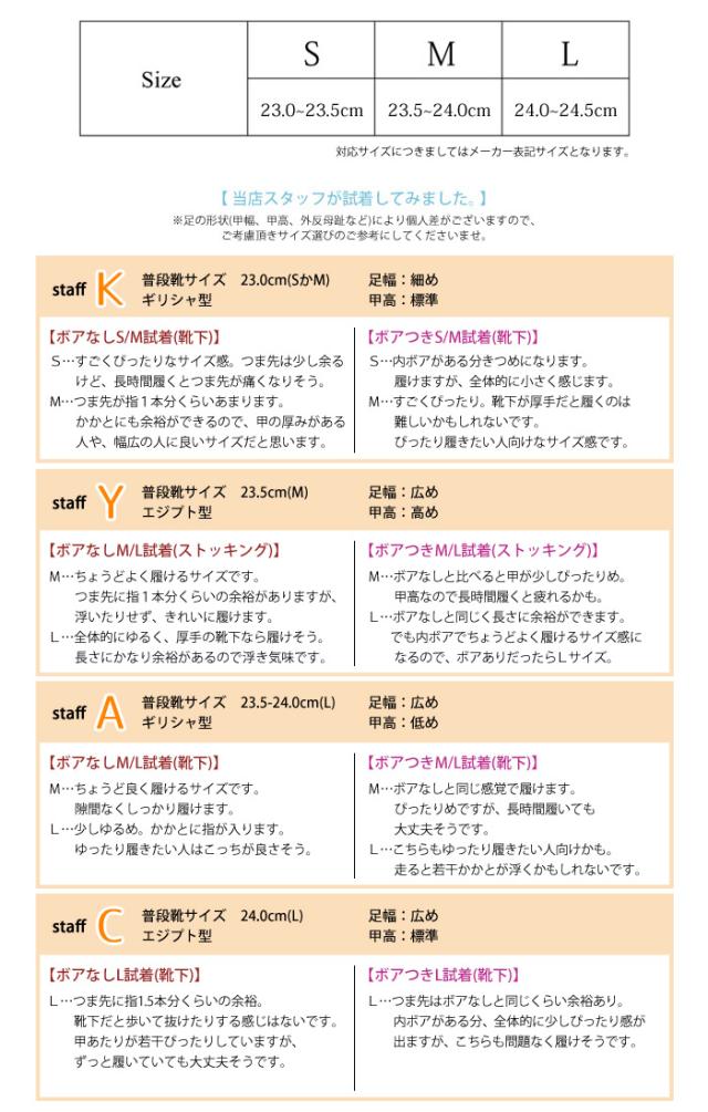 - 普段靴のサイズは24.0cmです。Lサイズを買いました。厚い靴下だとちょっと窮屈に感じますが、普通の厚さの靴下なら全然大丈夫です。軽くてあったかくてとても履きやすいです。