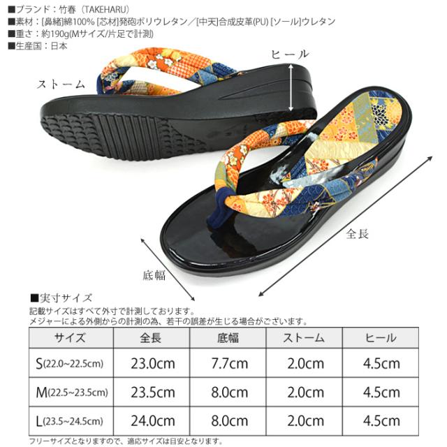 | 上品で女性らしいエナメル天の草履 程よいヒールの高さで疲れにくい! 日本の職人さんが作った、細かいところまで丁寧な仕上がりです。 ■ブランド:竹春(TAKEHARU) ■素材:[鼻緒]綿100% [芯材]発砲ポリウレタン/[中天]合成皮革(PU) [ソール]ウレタン ■重さ:約190g(Mサイズ/片足で計測) ■生産国:日本 ■実寸サイズ 記載サイズはすべて外寸で計測しております。 メジャーによる外側からの計測の為、若干の誤差が生じる場合がございます。 ■適応サイズ S(22.0〜22.5cm) M(22.5〜23.5cm) L(23.5〜24.5cm) ※サイズは目安となります。 <ご注意> ・大きな布から型をとっておりますので、画像と柄の位置が若干異なる場合がございます。 仕様となりますのでご了承くださいませ。 ※鼻緒は防水ではありませんのでご注意ください。 ※モデル着用写真は屋内外での撮影の為、光の影響で実際のカラーとは異なる場合がございます。 カラーバリエーションの画像が実物に最も近いお色味です。そちらをご参考ください。[1909] |