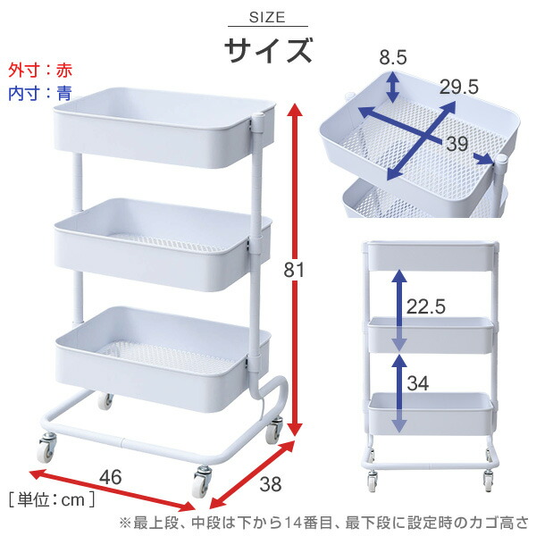 | 商品説明 | ●開梱時にハサミが必要です。組み立てには工具不要、スパナ同梱されています。 ※2020年2月1日よりカーキ色を、2022年11月18日よりグレージュ色を追加 ●上から放り込める、バスケットタイプのキャスター付きワゴン ●組み立てカンタン、スチールラックタイプの本体構造 ●3つのバスケットはモノに合わせて、2.5cm間隔、23段階で高さを選んで設置可能 ●どっしり安定、頑丈なつくり ●耐荷重:1段あたり20kg ●重量キャスターで、重いモノが載ってもスイスイ移動 ●バスケットの底は、野菜やタオルの収納にも合う、通気性の良いメッシュ仕様 ●表面はツヤのないマット仕上げ ●柱が3分割;上段、中段、下段。中段を抜いたり、上段を使わずに組み立てることで、2段にして利用可能、各高さは ・通常3段時: 81cm ・2段時(中段なし): 52.5cm ・2段時(上段なし): 53.5cm ●キャスターにストッパーはなし ●カゴ内寸高さ:(上)最上段、(中)上から11段目、(下)最下段に設定時 上〜中段: 間口16、内寸24.5cm 中〜下段: 間口23.5、内寸32cm ●カゴ内寸(最大):幅39 奥行29.5 深さ8.5cm ●耐荷重: 1段20kg、全体60kg |