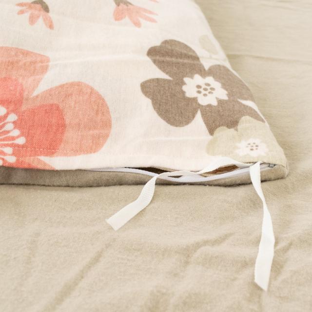 着脱しやすい全開ファスナーです。布団本体とカバーを固定する紐は8ヶ所につけられています。表面は華やかな表面に対し、裏面はスッキリとした無地カラーですので、バランスの良い寝室に仕上がります。