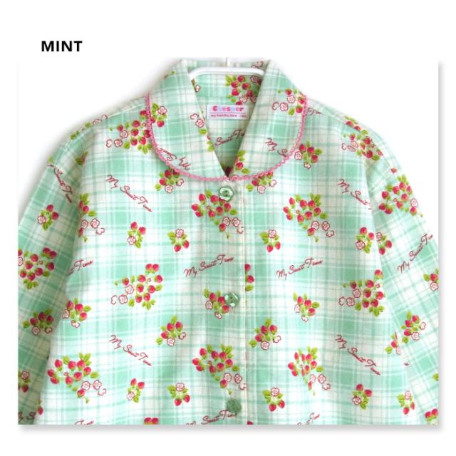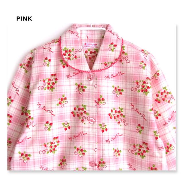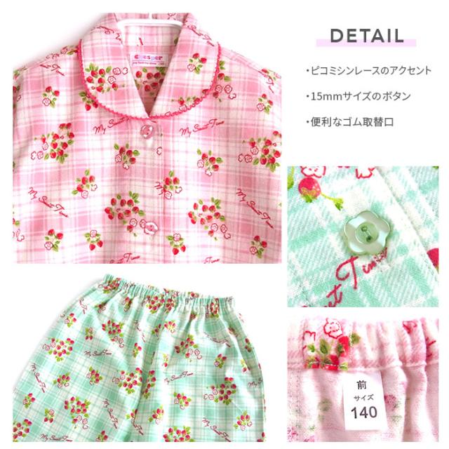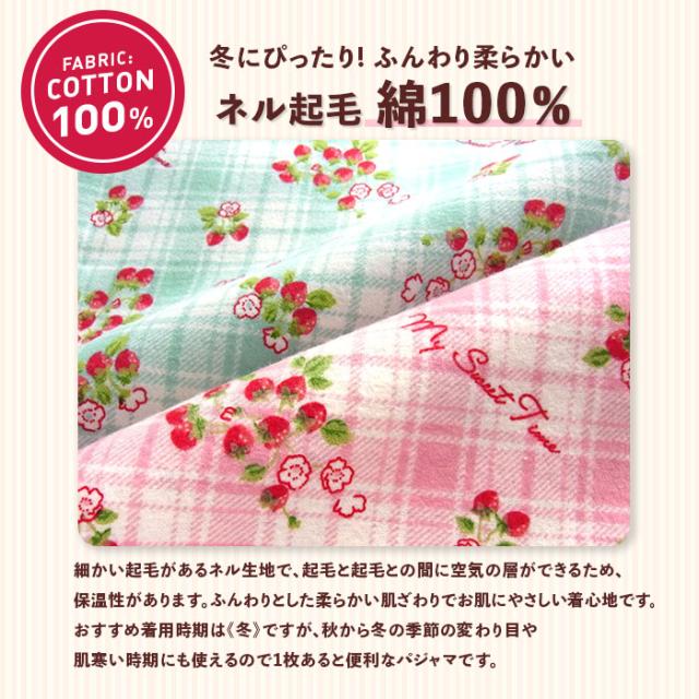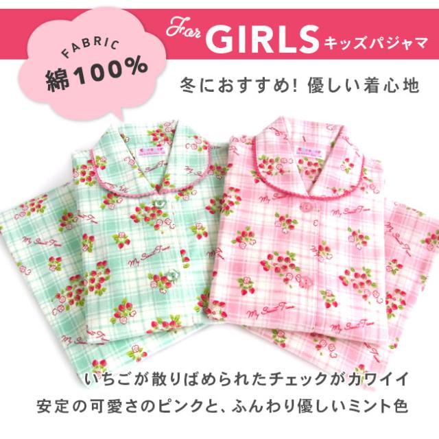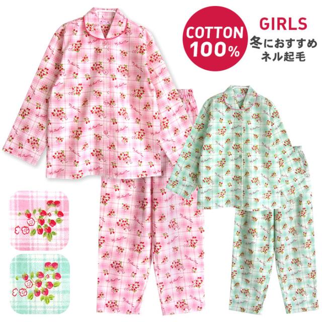 パジャマ キッズ 女の子 綿100% 長袖 冬 前開き ボタン ネル起毛 苺チェック柄 ピンク ミント 100 110 120 子供 ジュニア ガールズ かわいい