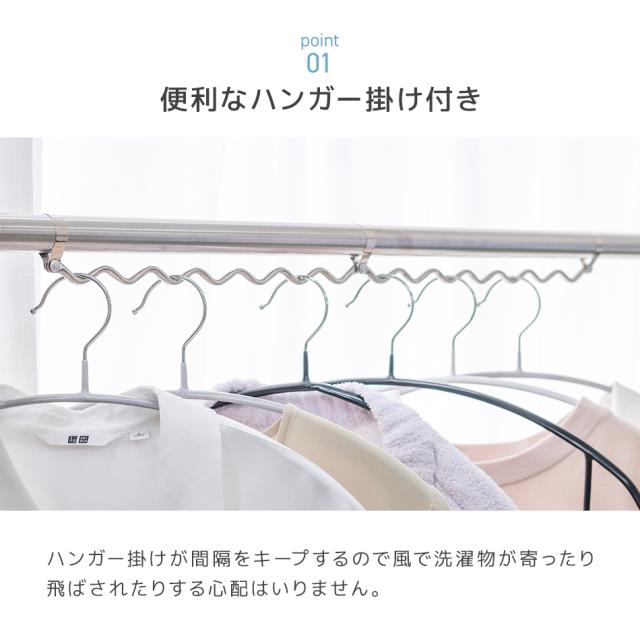 ハンガーに掛けた洗濯物が風で移動せず、間隔を保って干せる便利なハンガー掛付きです。
