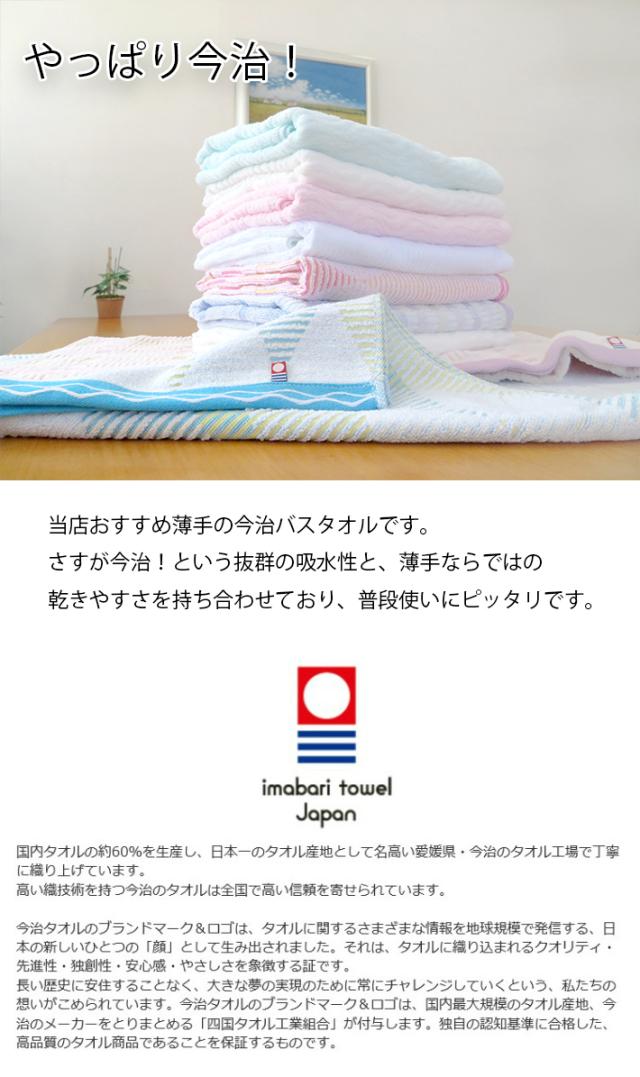 - 今治産のバスタオルが前からほしいと思い購入いたしました。とにかくもう一枚必要だと考えました。いざ使ってみたら高級感があり、肌ざわりが良く拭き心地がいいと感じました。