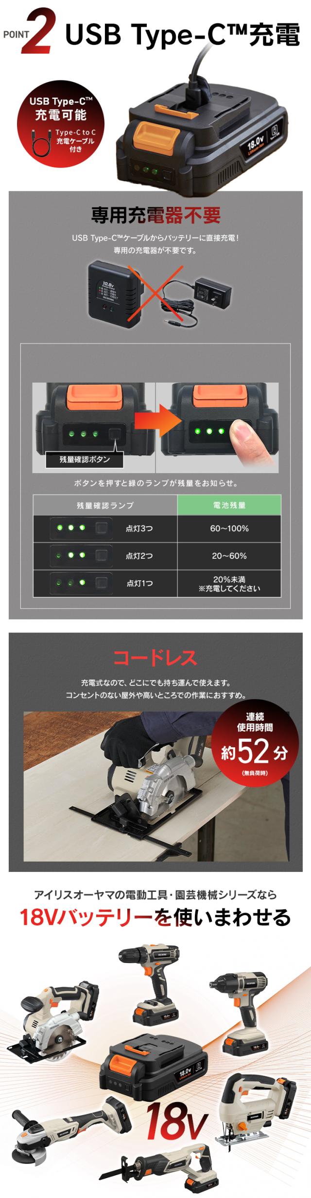 アイリスオーヤマの電動工具、園芸機械シリーズなら「18Vバッテリー」を使いまわせる。