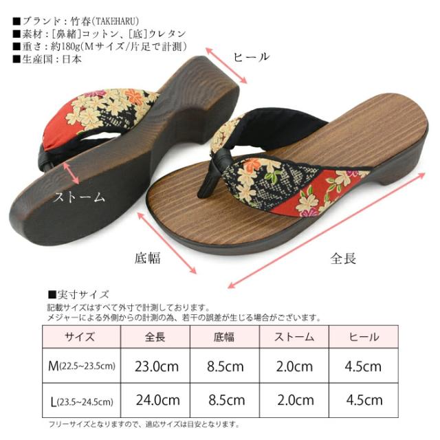 鮮やかな色味と桜の友禅柄がかわいい和柄サンダル。 鼻緒にはやわらかく足あたりの良い素材を使用。 ソールは温かみのある茶色の木目プリント。 滑りにくいウレタン底でお手入れも簡単! 日本の職人さんの手で丁寧に作られた一足です。 ■ブランド:竹春(TAKEHARU) ■素材:[底]ウレタン[甲部分]コットン ■重さ:約180g(Mサイズ/片足で計測) ■生産国:日本 ■実寸サイズ 記載サイズはすべて外寸で計測しております。 メジャーによる外側からの計測の為、若干の誤差が生じる場合がございます。 ■適応サイズ M(22.5〜23.5cm)、L(23.5〜24.5cm) ※サイズは目安となります。 <注意事項> ・商品は防水されておりません。カビなどの原因となりますので、雨天時はご使用をお控えください。 ※モデル着用写真は屋内外での撮影の為、光の影響で実際のカラーとは異なる場合がございます。 カラーバリエーションの画像が実物に最も近いお色味です。そちらをご参考ください。 [2002] |
