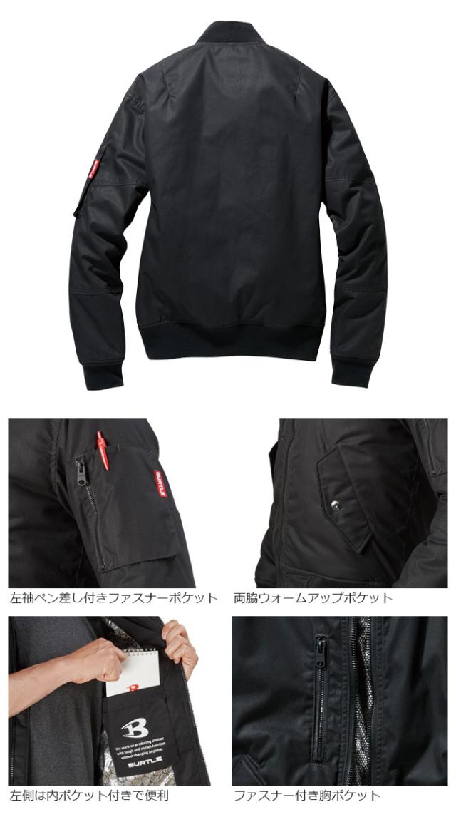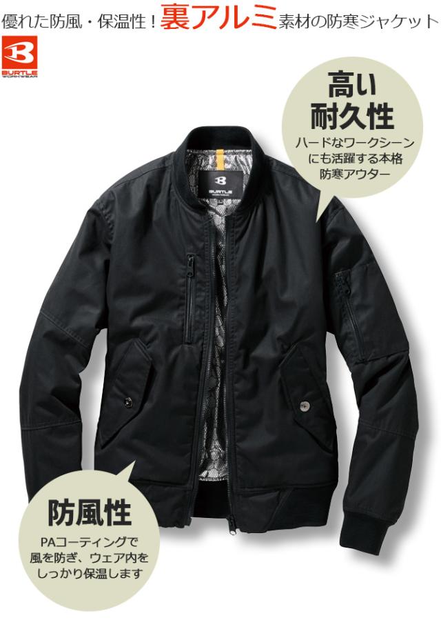 | BURTLE(バートル)のミリタリーテイストの中綿入り防寒ジャケットです。 耐久性のあるT/Cタッサー素材を採用し、PAコーディングの防風性と裏地アルミフィルムラミネートの保温性により、優れた防寒性と優れた耐久性を両立しています。 ポケット類も充実しており、両脇のポケットは手を入れると温かいウォームアップポケットになっています。 普段使いもできるスタイリッシュなデザインの定番フライトジャケットを、ハードなワークシーンでしっかりと機能する本格ワーク仕様に仕上げています。 | ||||||