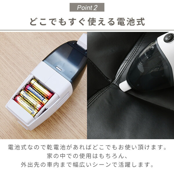 - 軽くてコンパクトです。電池式なら車で使っててもいいなぁと思い購入。いざ使ったらしっかりゴミもとれてます。