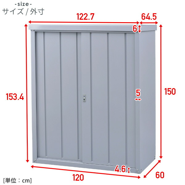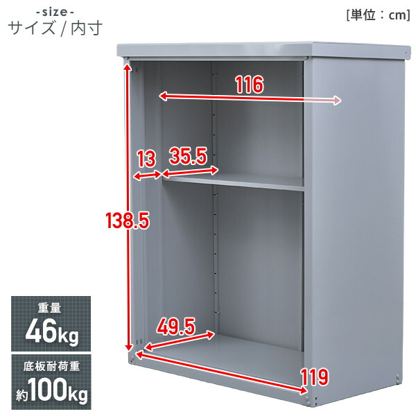 | 商品説明 | ●省スペースながらオリコンが収納可能な奥行の広いスチール製収納庫 ●奥行(内寸)を通常タイプよりも+15cm広い49.5cm確保 ●アウトドア用収納ボックスの保管にも最適なサイズ感 ●カラーはお庭で主張しすぎず、さりげなくおしゃれを演出できるライトグレー ●サビに強い:ハイテンション亜鉛メッキ鋼板採用で硬度UP ●扉に吊り戸式を採用し、開閉がスムーズ ●収納物が出し入れしやすい下部レール部フラット仕様 ●安心の専用鍵付き ●収納部内寸:幅116×奥行49.5×高さ138.5cm ●可動棚1枚付属 ●可動段数:13段 ●耐荷重:(底板)約100kg、(棚板)約30kg ※完全防水仕様ではないため、吹き込みなどによる雨水侵入のおそれがあります ※2022年1月11日販売分よりデザイン(見た目)をリニューアルしました ※旧タイプをお持ちの方は追加購入時はデザインが異なりますのでご注意ください |