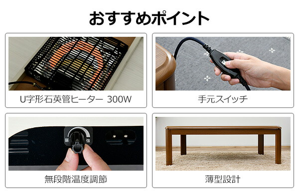 | 商品説明 | ●電源:100V (50Hz/60Hz) ●消費電力:300W ●コントローラー:中間入切スイッチ ●U字型石英管ヒーター ●温度制御:サーモスタット ●安全装置:温度ヒューズ ●電源コード長さ:3m ●一時間あたり消費電力量:(強)約160Wh、(弱)約80Wh ●一時間あたり電気代目安:(強)約5円、(弱)約2.5円 ※電力料金目安単価1kWhあたり31円(税込)で算出 ●コタツ側面の温度目安:(強)約55度、(弱)約37度 ●付属品:ヒーター取付用化粧ビス4本 ●取付枠サイズ:29cm角 専用 ●ビスで4箇所留めるだけの簡単取替!特別な工具は一切必要ありません ●メーカー保証:1年 |