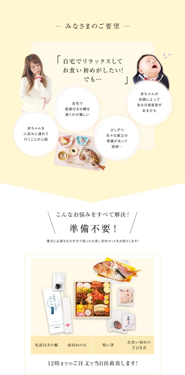 | 内容量 | ●お食い初め重×1 ●祝い鯛姿焼き(水揚げ時加工前400g / 下処理焼き加工後190g)×1 ●お赤飯×1 ●蛤×1 ●お吸い物の素×1 ●歯固めの石×1 ●祝い箸×1 ●鯛飾り×1 ●敷き紙×1 ●風呂敷×1 ●お食い初め食器セット×1(平椀:Φ10×4cm、飯椀:Φ10×5.8cm、汁椀 Φ:9.2×5cm、つぼ椀:Φ7.4×5cm、膳:27.7×27.7×5.7cm(ウレタン塗装))●箱サイズ 28×28×6cm ●箸の長さ 22.5cm(ポリエステル塗装) |