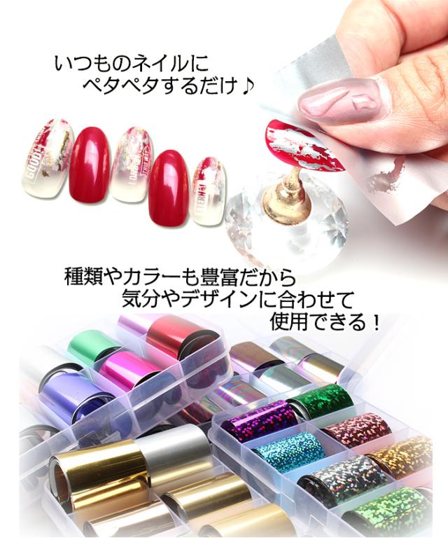 | 商品説明 | いつものネイルにペタペタするだけ アートホイルネイルが完成♪ 種類やカラーバリエーション豊富で シールやパーツとの相性も抜群です★ 未硬化ジェルのべたつきを利用して貼り付けてください |