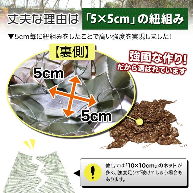 【丈夫な作り】丈夫な作りの秘訣は裏側が2重構造であることと、5cm毎の紐組みで作られていることです。他商品では「10×10cm」のネットが多く、強度が足りず破けてしまう場合もありますが、当商品は「5m×5m」の紐組みで高い強度を実現しました。