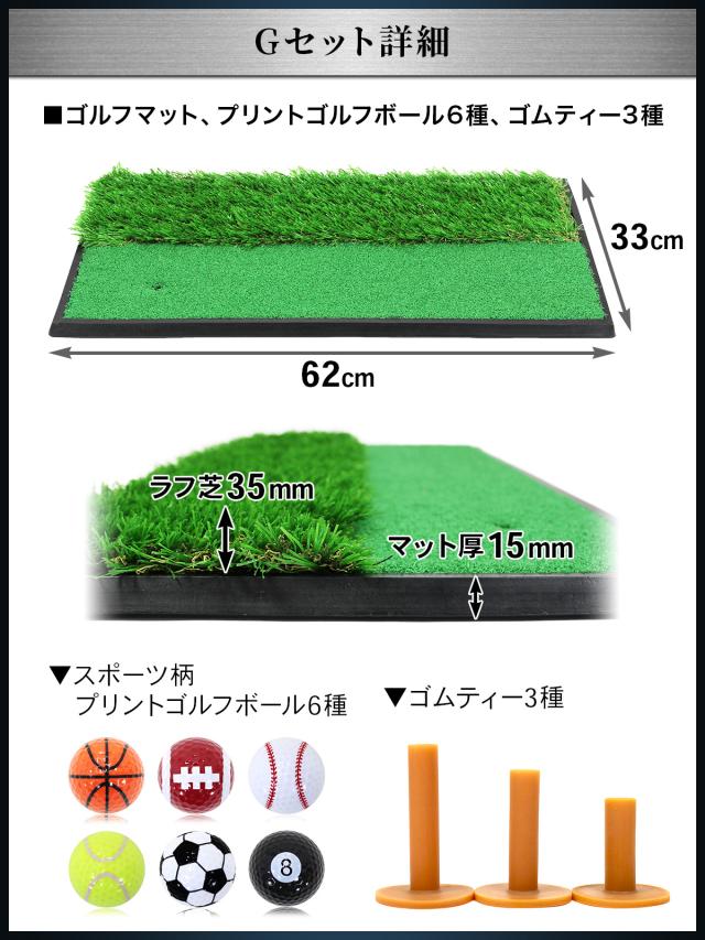 2WAYゴルフマット、スポーツ柄プリントゴルフボール6種、ゴムティー3種