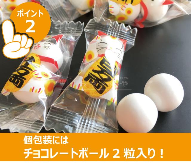 10種類のかわいい招きねこがプリントされた個包装に、直径13mmのチョコレートボールが2粒入っています。