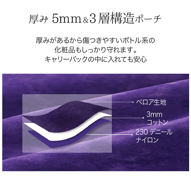 厚み5mm&3層構造ポーチだから、傷つきやすいボトル系の化粧品もしっかり守れます。