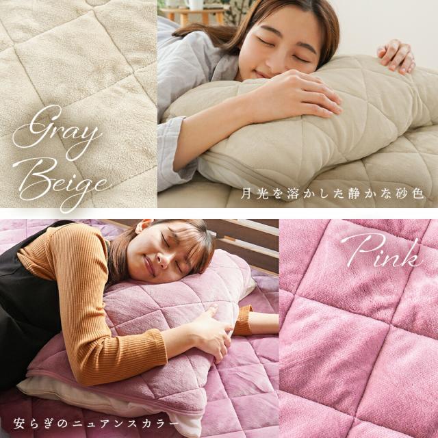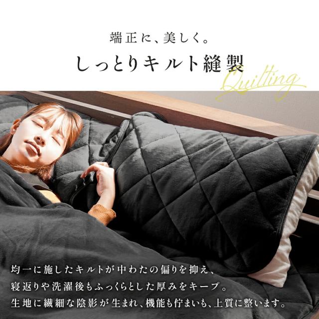・上品なオトナの艶めき 極上のなめらかさ 凛かな艶が誘う、大人の余韻。ベルベット光沢、しなやかフランネル。肌に寄り添い、なめらかに滑る。纏うたび、心ほどける。 ・とろみを纏う、フランネル生地表面は程よく起毛して、ふわり。短い毛足が肌をなでて、驚くほどなめらかに。冬の冷えた空気の中でも、使い心地はやさしい。 ・静かに温める、確かなぬくもり。しっかりと目の詰んだ生地がおもて面に空気層をつくり、朝までそっとぬくもりをキープ。頬を預ければ、首筋まではどける安らぎ。 ・端正に、美しく。しっとりキルト縫製均一に施したキルトが中わたの偏りを抑え、寝返りや洗濯後もふっくらとした厚みをキープ。生地に繊細な陰影が生まれ、機能も併せもつ、上質に整います。 ・静かに支える、二本の品格 ゴムバンド付きしなやかな2本ゴムが面全体を均一に押さえ、フィットは朝まで凛として。洗いたい時はさっと外して、また端正に整います。 ・創業450年以上の信頼 西川品質という、安心。受け継がれてきた伝統と、現代の睡眠研究。素材選定から縫製・検査まで、上質のための基準を一枚に。毎晩つかうものだからこそ、迷わず“西川製”。 |