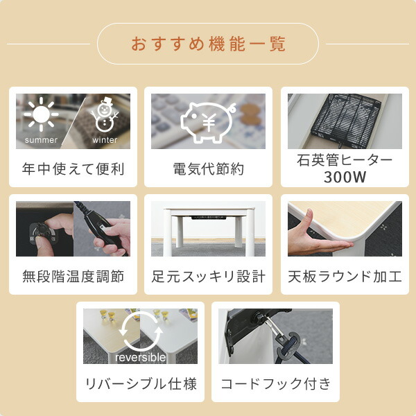 | 商品説明 | ●電源:100V (50Hz/60Hz) ●ヒーター型番:MS-303H ●消費電力:300W ●電気代目安(1時間あたり):(強)5.0円、(弱)2.5円 ※電力料金目安単価1kWhあたり31円(税込)で算出 ●電源コード:中間入切スイッチ ●1人暮らしや新生活で活躍するこたつテーブル ●天板はリバーシブル仕様 ●夏はセンターテーブル、冬はこたつとして一年中活躍 ●どんなお部屋にも合うシンプルなデザイン ●メーカー保証:1年 |