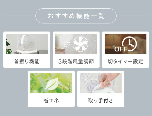 | 商品説明 | ●電源:AC100V(50/60Hz) ●消費電力:38/39W(50/60Hz) ●電気代目安(1時間あたり):約1.2円(50/60Hz) ●コード長さ:約1.6m ●操作方法:押しボタンスイッチ式 ●切タイマー:最高3時間 ●風量:3段階(弱・中・強) ●ワイヤーガード ●首振り(後部に首振りつまみ) ●メーカー保証1年付き ※2025年2月よりブルーグレー色→アイスグレー色にカラーを変更しております ※商品の色味は、撮影環境やお使いのモニターによって、見え方が若干異なる場合がございます |