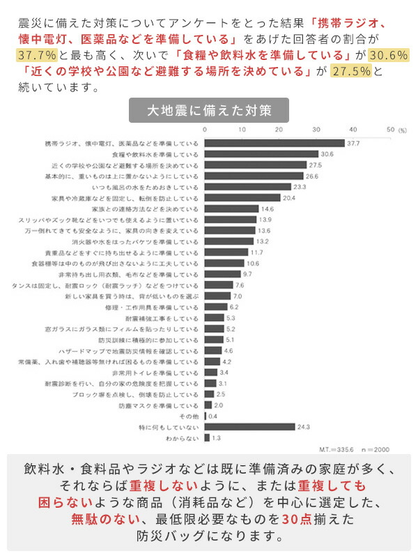 | 商品説明 | ●セット内容:リュックサック、緊急用ホイッスル、2WAYドライバー、カッター、圧縮袋、予備袋、筆記用具セット、歯ブラシ×3本、綿棒×20本、マスク×3枚、携帯トイレ×3個、45Lポリ袋×3枚、紙皿×3枚、プラカップ×5個、割り箸×5膳、スプーン・フォークセット、2WAY懐中電灯、ラバー手袋、お薬ケース、布テープ、レインポンチョ、サンダル、アルミシート、アルミブランケット、エア枕、非常用給水バッグ、ラップ、アルミホイル、ボディタオル、ティッシュ ※本製品は18年3月1日より型番変更をしております 【変更箇所】 ※バッグの色がオレンジ色→赤色に変更。さらにブラック色追加 ※セット内容一部変更(PEロープ→圧縮袋に変更)(ライター→お薬ケースに変更) |
