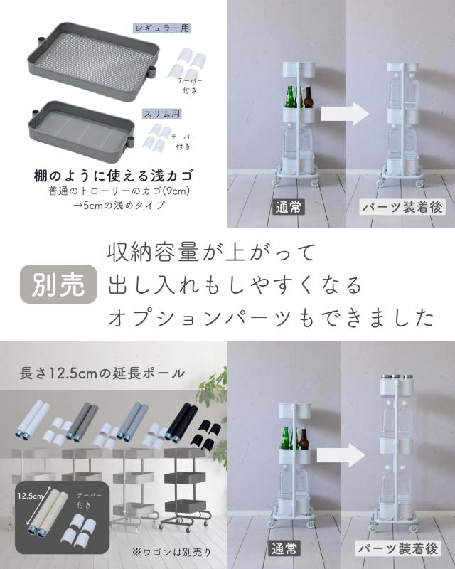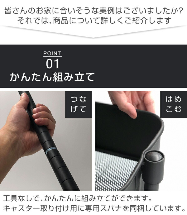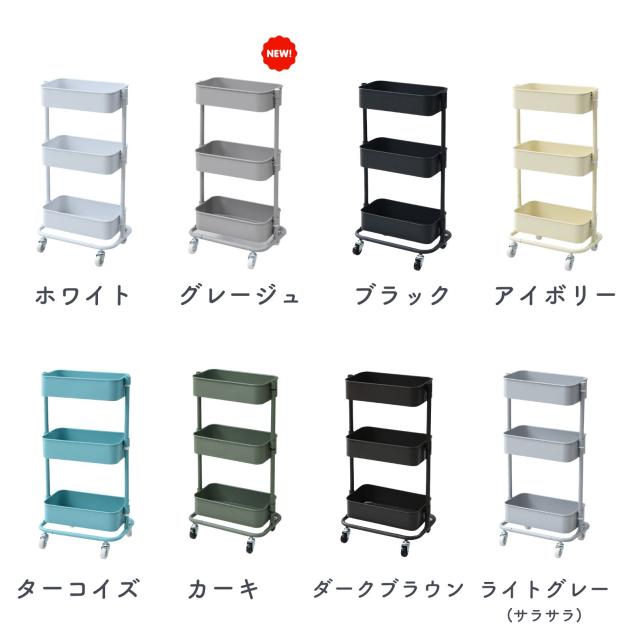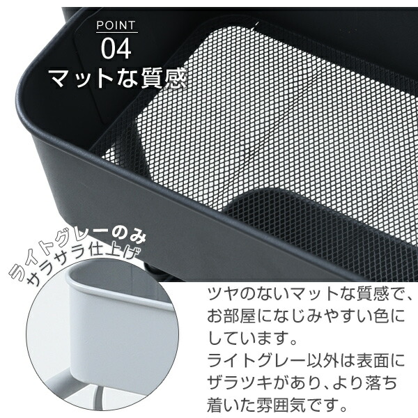 | 商品説明 | ●開梱時にハサミが必要です。組み立てには工具不要、スパナ同梱されています。 ※2020年2月1日よりカーキ色を、2022年11月18日よりグレージュ色を追加 ●上から放り込める、バスケットタイプのキャスター付きワゴン ●組み立てカンタン、スチールラックタイプの本体構造 ●3つのバスケットはモノに合わせて、2.5cm間隔、23段階で高さを選んで設置可能 ●どっしり安定、頑丈なつくり ●耐荷重:1段あたり20kg ●重量キャスターで、重いモノが載ってもスイスイ移動 ●バスケットの底は、野菜やタオルの収納にも合う、通気性の良いメッシュ仕様 ●表面はツヤのないマット仕上げ ●柱が3分割;上段、中段、下段。中段を抜いたり、上段を使わずに組み立てることで、2段にして利用可能、各高さは ・通常3段時: 81cm ・2段時(中段なし): 52.5cm ・2段時(上段なし): 53.5cm ●キャスターにストッパーはなし ●カゴ内寸高さ:(上)最上段、(中)上から11段目、(下)最下段に設定時 上〜中段: 間口16、内寸24.5cm 中〜下段: 間口23.5、内寸32cm ●カゴ内寸(最大):幅39 奥行29.5 深さ8.5cm ●耐荷重: 1段20kg、全体60kg |