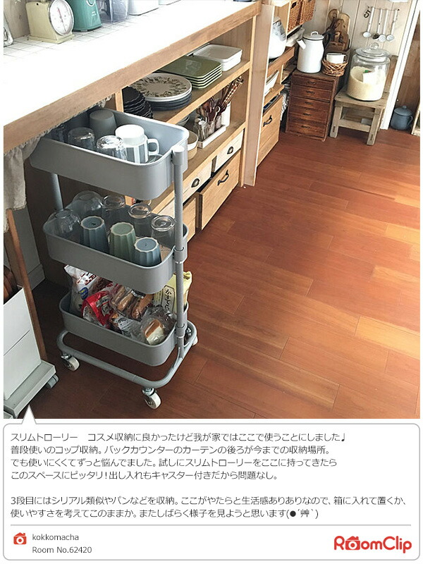 - スリムタイプは台所で使っています。飲み物のストックを入れたりパンやお菓子のちょい置きに使ったり、3段あるのでとても重宝しています。掃除も楽になりました。
