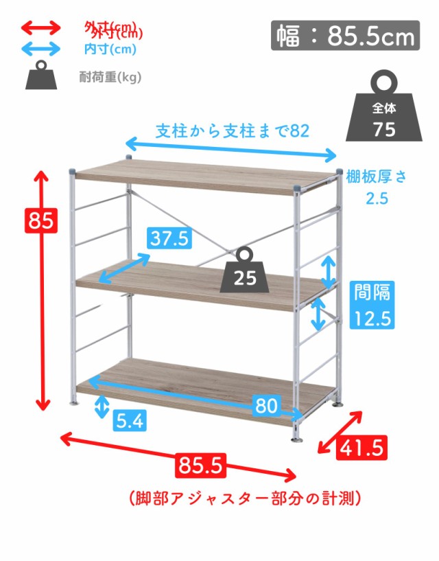| 商品説明 | ●プラスドライバーをご用意ください。 ※重量もあるため、お二人以上での組み立てをおすすめいたします。 ※簡単設置構造のため、横揺れします。耐荷重には影響ございませんが、ご利用時に気になる場合は、『コの字補強バー』もご利用ください。 ※本体外寸の「幅」は、足元のアジャスターの外側〜外側の寸法になります。 ※2022年2月2日より、新色Aホワイトが追加されました。 ●モノに合わせて棚の位置を変えられる木製棚板のスチールラック ●インボックスなど収納ボックスが縦にすっぽり収まるサイズ設計 ●棚板は木の質感があってお手入れもかんたんな、合成樹脂化粧繊維板 ●軽くて強いフラッシュ構造で、1段あたり25kgの耐荷重 ●フックでフレームに引っ掛けるだけなので、位置の変更もかんたん ●棚板を追加したり複数揃えると、フラットに横連結可能 ●脚部には、ガタつきを抑えるアジャスター付き ●耐荷重: 1段あたり25kg、全体75kg ●可動式棚板3枚(板の厚さ2.5cm、約12.5cm間隔、7段階高さ調節) ●(最下段時)棚板下5.4cm ●棚板サイズ: 幅80 奥行き37.5cm ▼別売りパーツの取り扱いを2022年1月より開始しました ・キャスターセット(ストッパー付き2個、ストッパーなし2個) ・追加棚板 ・コの字補強バー ・帆立(側フレーム、片側ずつ) ・クロスバー ●専用キャスター装着時耐荷重: 1段あたり25kg 全体100kg ●専用キャスター装着時: 本体高さ89cm ▼2025年1月より以下のパーツが追加となります。 ・2段引き出し ・スライド棚 ・ストッカー+コの字バー |