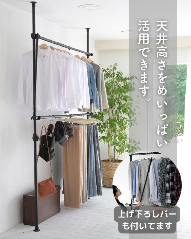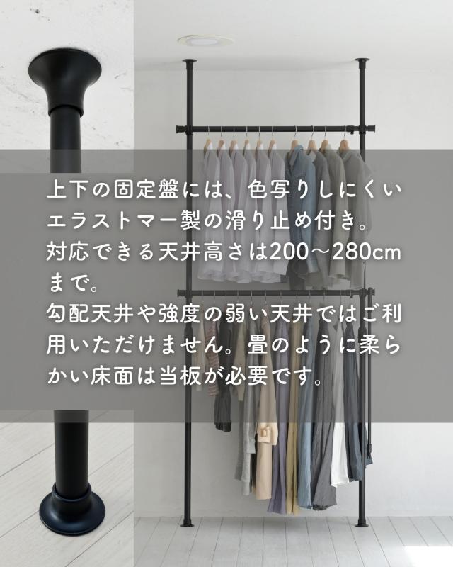 | 商品説明 | ※2025年1月27日より、グレージュ(ツヤなし)が追加されました。 ※2019年1月7日より、カラーバリエーションが増えました。つやのないマットなタイプが仲間入り。 【取り付け時の注意事項】 ※柔らかい床面や強度の弱い天井へは設置ができません。 ※勾配天井は対応できません。 ●最大80着、2段式の大容量ハンガーラック ●設置場所を柔軟に選べる突っ張り固定式、スプリング圧縮式で安定性バツグン ●最大高さ280cmまで設置可能 ●横幅伸縮、ハンガーバーの高さもお好みで設定可能 ●引っかけ棒付属で、高い上段でもラクラク出し入れ ●シャツ収納目安: 80着(1段あたり40着) ●全体耐荷重: 60kg(1段あたり30kg) ●設置は工具不要でラクラク ●実用新案取得のワンタッチ突っ張り構造 ●ハンガーバー高さ: 110-270cm ●設置天井高さ: 200-280、140-188cm ※188-200cmの天井には設置できません。 支柱の一部が2本のパイプを連結する仕様です。 上部ポールを連結する/しないの間で生じる、設置ができないすきまゾーンがございますので以下の高さに設置可能です ■連結する場合(通常の使用方法) 高さ: 200-280cm ■連結しない場合(部品を一部使わず短く設置)高さ: 140-188cm その為、188-200cmの高さでは設置ができない作りとなっております。 |