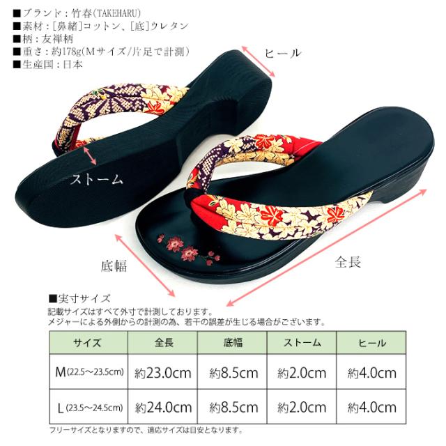 | 上品で女性らしいエナメル天の草履 程よいヒールの高さで疲れにくい♪ 日本の職人さんが作った、細かいところまで丁寧な仕上がりです。 ■ブランド:竹春(TAKEHARU) ■素材:[鼻緒]コットン[底]ウレタン ■重さ:約178g(Mサイズ/片足で計測) ■生産国:日本 ■実寸サイズ 記載サイズはすべて外寸で計測しております。 メジャーによる外側からの計測の為、若干の誤差が生じる場合がございます。 ■適応サイズ M(22.5〜23.5cm)、L(23.5〜24.5cm) ※サイズは目安となります。 <ご注意> ※大きな布から型をとっておりますので、画像と柄の位置が若干異なる場合がございます。仕様となりますのでご了承くださいませ。 ※鼻緒は防水ではありませんのでご注意ください。 ※商品は水濡れにも耐性がある素材となりますが、長時間水に濡れていると劣化を早める原因となりますのでご注意ください。 ※モデル着用写真は屋内外での撮影の為、光の影響で実際のカラーとは異なる場合がございます。 カラーバリエーションの画像が実物に最も近いお色味です。そちらをご参考ください。[1911] |