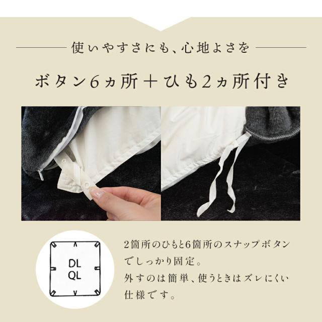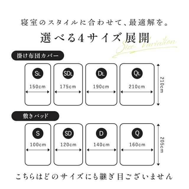 仄かな艶が誘う、大人の気配。ベルベット級の光沢、しなやかなフランネル。肌に寄り添い、なめらかにすべる。纏うたび、心まで解けていく。 とろみを纏う、フランネル生地表面は程よく起毛して、ふわり。短い毛足が肌をなでて、驚くほどなめらかに。冬の冷えた空気の中でも、使い心地はやさしい。 静かに温める、確かなぬくもり。しっかりと目の詰んだ生地が空気層をつくり、夜通しあたたかく、体温を上品に保つ。すっぽりと身を委ねれば、心まで温もる。 一枚、二役。 季節をまとう2Way。冬は掛け布団カバーとして上質に保温。春秋は毛布としてしっとり軽やかに。一枚使いでも毛布として頼れるから、ワンルームでも上品にミニマル。 両サイドファスナーで、フルオープン。 着脱は、優雅に簡単。端まで大きく開くファスナーを左右に。布団の角まで手が届き、ひも留めはラクに、仕上がりは上品に。暮らしに、余裕という心地よさを。 端正に、美しく。しっとりキルト縫製均一に施したキルトが中わたの偏りを抑え、寝返りや洗濯後もふっくらとした厚みをキープ。生地に繊細な陰影が生まれ、機能も佇まいも、上質に整います。 四隅で留める、上質な安定。四隅ゴムバンド付き四隅のゴムがマットレスにしっかり固定。寝返りでもズレにくく、装着・取り外しはワンアクション。気になった時にさっと外して洗え、清潔もスマートに。 静かに支える、二本の品格 ゴムバンド付きしなやかな2本ゴムが面全体を均一に押さえ、フィットは朝まで凛として。洗いたい時はさっと外して、また端正に整います。 気が向いたら、洗うだけ。清潔が暮らしの標準に。おうちの洗濯機で気軽にケア。しっとりしたとろみ感はそのままに、心地よさを清潔に保ちます。 創業450年以上の信頼。西川品質という、安心。受け継がれてきた伝統と、現代の睡眠研究。素材選定から縫製・検査まで、上質のための基準を一枚に。毎晩つかうものだからこそ、迷わず“西川製”。 当社オリジナルブランド、纏生「纏生(まとい)」は、冬の空気をやわらげるために生まれた、なめらかフランネルのシリーズ。寒い夜もふわりと空気を含み、ため息がひとつ。至福は、そっと日常に。 |