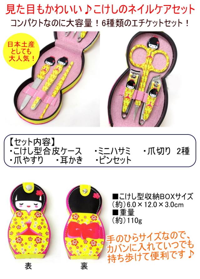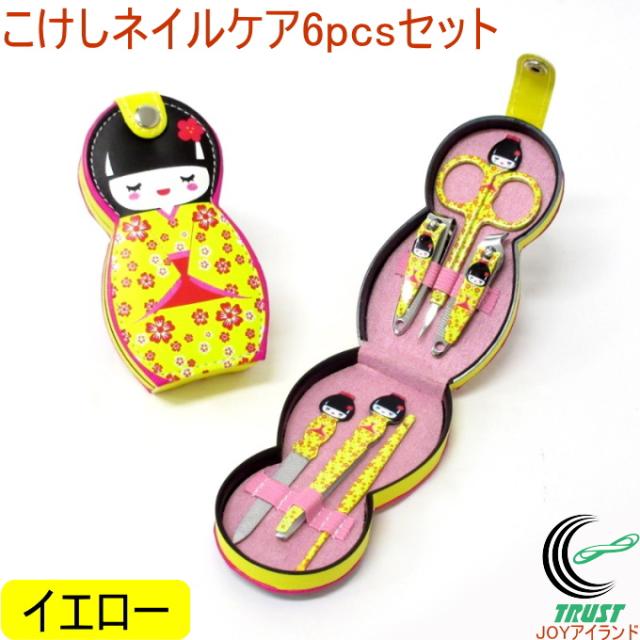 こけしネイルケア6点セット イエロー (303-515) こけし 小物 携帯 ネイル ネイルケア 爪切り やすり ミニはさみ 耳かき ピンセット