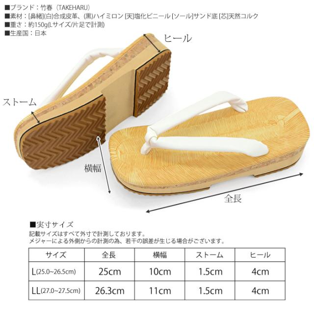 | クッション性が高くとても軽量なコルク芯を使った黄千葉雪駄! カバー付きの梅雨履きと選べる2タイプ。 普段履きはもちろん、お祭りや神職、飲食、武術家関係の方など幅広くご愛用頂けます。 ■ブランド:竹春(TAKEHARU) ■生産地:日本 ■足のサイズ:フリーサイズ ■素材:[表]塩化ビニール、[底]サンド底、[芯]天然コルク [白鼻緒]合成皮革 [黒鼻緒]ハイミロン ※黒鼻緒のみ、白い足袋などでのご使用や、素足でも汗をかくと生地が色移りする場合がありますのでご注意ください。 ■適応サイズ L:約25〜26.5cm LL:約27〜27.5cm ※雪駄はフリーサイズとなりますので、サイズは履きやすいサイズとなり、あくまで目安となります。 【履き方のコツ】 履き始めは鼻緒が固く履きにくさを感じるかと思いますので、鼻緒の後ろや先坪の部分を軽くひっぱり、鼻緒を指で押しつぶして柔らかくすると履きやすくなります。 ※無理に強い力で引っ張ると鼻緒が抜ける恐れがございます。 履き始めは鼻緒が窮屈に感じられますが、履き込むほど鼻緒が程よく伸び、足に馴染んできます。 雪駄を履く時は親指と人指し指の間に余裕を持たせ、かかとが少し飛び出るくらい浅めに履くと鼻緒で指の間を痛めにくいです。歩く際には重心が前になるように意識する事がコツです。 【サイズ選びのポイント】 雪駄は本来、かかとを少し出して履くのが一般的な履き方とされております。 履いていてかかとが痛くないほどの出方がちょうど良いサイズです。 足全体が台に乗った方が楽な方もいらっしゃいますので、ご自分のスタイルに合ったサイズをお選びください。 【長く使うためのコツ】 雪駄には左右がありませんので、時々左右を履き替えて頂くと長持ちします。 <ご注意> ・実寸サイズにつきましては画像をご確認ください。 ・メジャーでの計測のため、実寸サイズとは多少異なる場合がございます。 ・商品は水濡れにも耐性がある素材となりますが、長時間水に濡れていると劣化を早める原因となりますのでご注意ください。 [2003] |