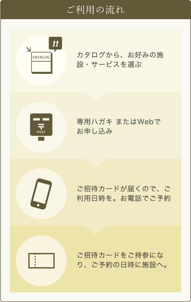 カタログを受け取った方に、お選びいただいた宿泊施設からの「ご招待カード」をお届けする、新しいかたちの選べるギフトです。