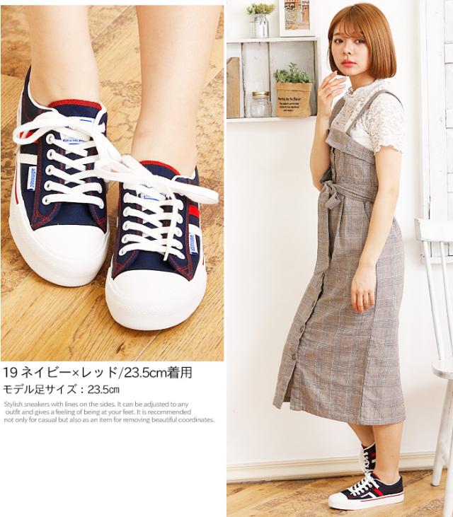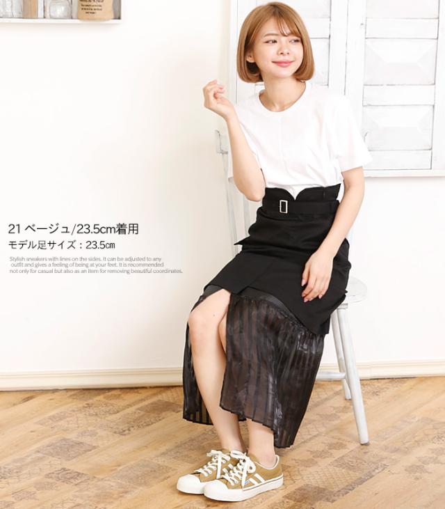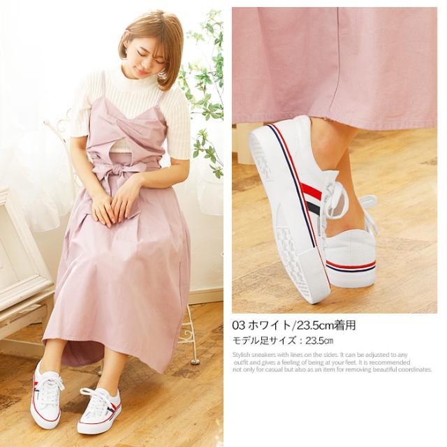 サイドにラインの入ったスタイリッシュデザインのスニーカー。 どんなコーデにも合わせられて、足元にこなれ感をプラス♪ カジュアルはもちろん、きれいめコーデの外しアイテムとしてもおすすめ◎ ────────────────────────────────── ■サイズ 22.5cm、23cm、23.5cm、24cm、24.5cm ■素材・成分:[甲材]合成繊維[底材]合成底 ■重量:約290g(23.5cm、片足で計測) ■生産地:中国 <注意事項> ※お客様のご覧になられますパソコン機器及びモニタなどの違い、また室内、室外での撮影により実際の商品素材の色と相違する場合もありますのでご了承下さい。なお著しい色の相違は御座いません。 ※モデル着用写真は屋内外での撮影の為、光の影響で実際のカラーとは異なる場合がございます。カラーバリエーションの画像が実物に最も近いお色味です。そちらをご参考ください。 [1912] |