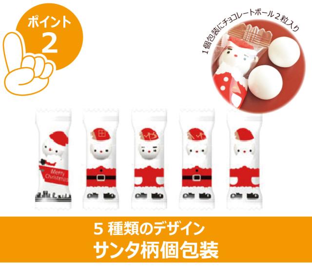 5種類のサンタの可愛いイラストがプリントされた個包装に直径13mmのチョコレートボールが2粒入っています。