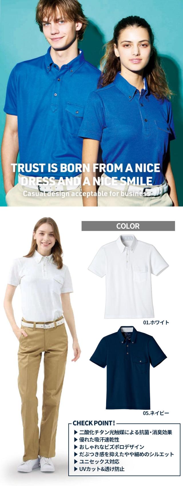 高機能素材が優れた効果を発揮するビズポロ。光触媒素材による抗菌・消臭効果でハードワークも安心。きちんと感のある襟元や細身のシルエットは好印象で、接客にぴったり。