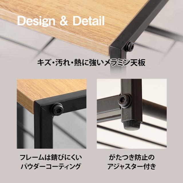 | ●お部屋のインテリアに合わせやすい2色展開 ●キッチンの収納棚として、レンジやポット、炊飯器などまとめてコンパクトに収納できる ●フレームの両サイドにあるバーはS字フックなどを掛けることで引っ掛け収納が可能 棚板だけでなくフレームのサイド部分も収納に使える無駄のない設計。 ●木目模様と細いフレームでシンプルで馴染みやすいインテリア性を実現 ●サッと置けて出し入れ楽々なオープンタイプ ●圧迫感を感じにくい開放的なデザイン ●熱や水に強く、傷がつきにくいので、メンテナンスが簡単 ●軽量で女性の方でも容易に持ち運べます ●シンプルなデザインで永く幅広く使える設計です ●お部屋になじみやすい無地・木目調デザイン ●安定感を高めてお使い頂けるアジャスター付き ●商品によって色味や木目などの風合いが異なります ●組立時間(目安)(大人1人)お客様組立(40分) |
