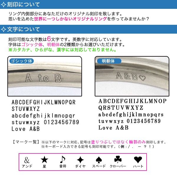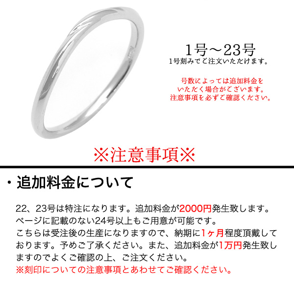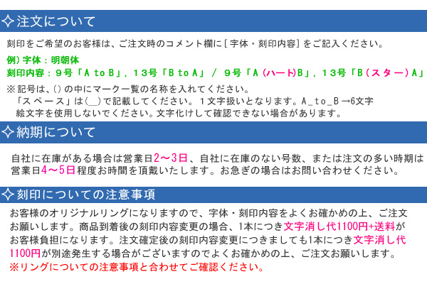 【注意事項】 ※お客様のオリジナルリングになりますので、刻印内容をよくお確かめの上、 ご注文お願いします。※着用したままの入浴や就寝は変形・破損・紛失等の原因となりますのでお外しください。
