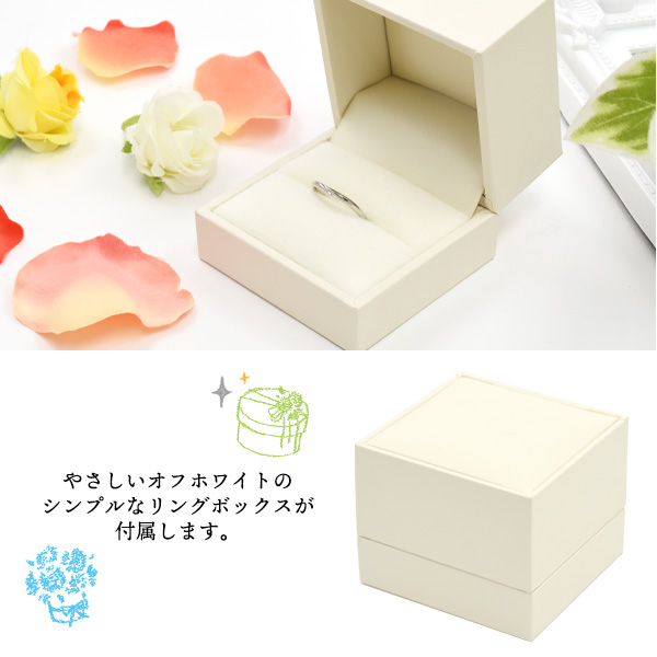 やさしいオフホワイトのシンプルなリングボックスが付属します。