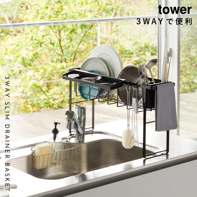 スリムスリーウェイ水切りワイヤーバスケット2段 タワー 山崎実業 tower 水切りラック シンク上 スリム 15cm 2段 おしゃれ モノトーン ホワイト ブラック 5070 5071 メーカー直送