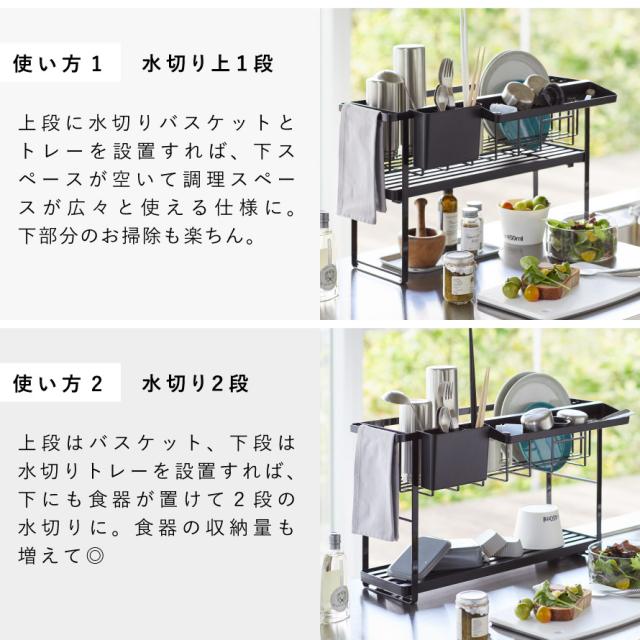 上段はバスケット、下段は水切りトレーを設置すれば、下にも食器が置けて2段の水切りに。食器の収納量も増えて◎