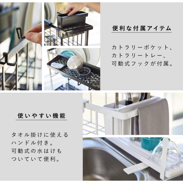 また、タオル掛けに使えるハンドル、可動式の水はけもついていて便利です。水切りトレーには、水止栓がついているので排水できない場所でも安心。