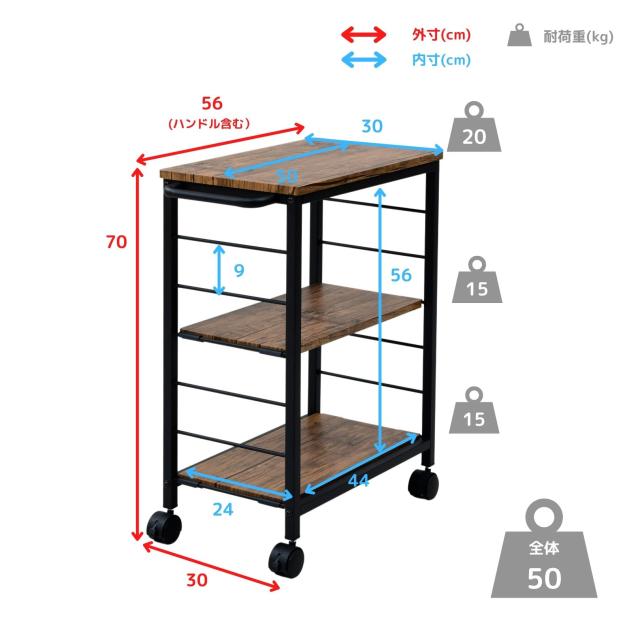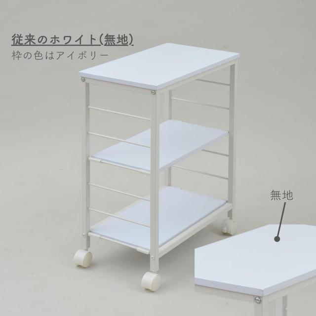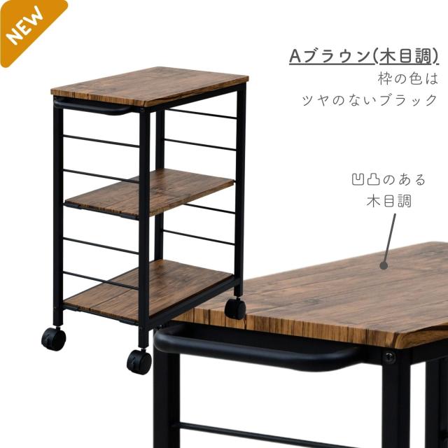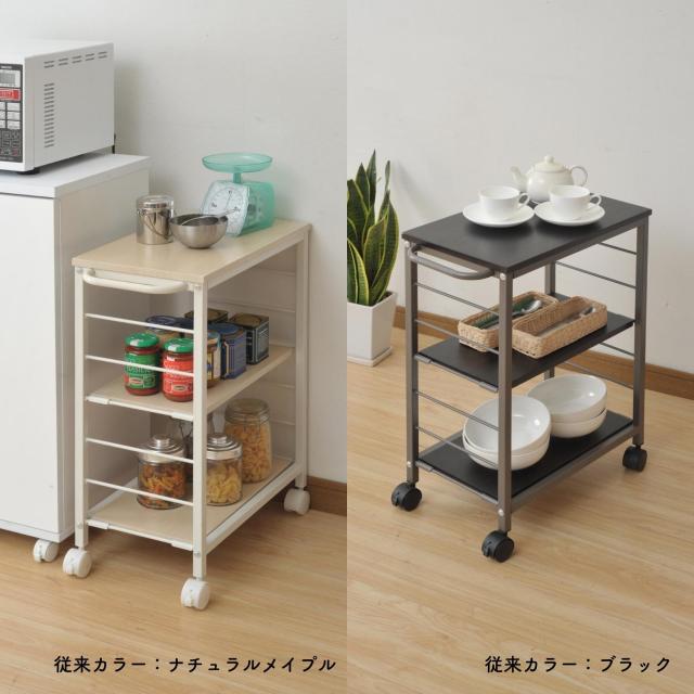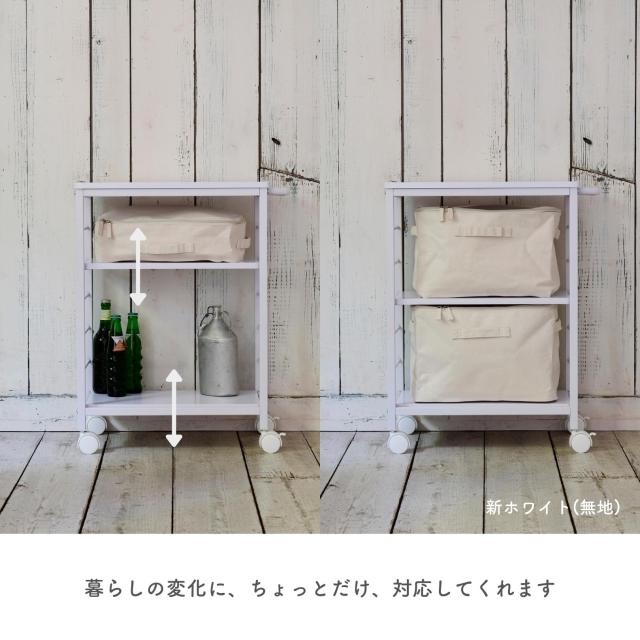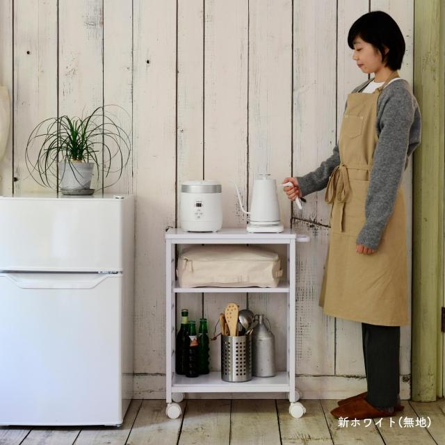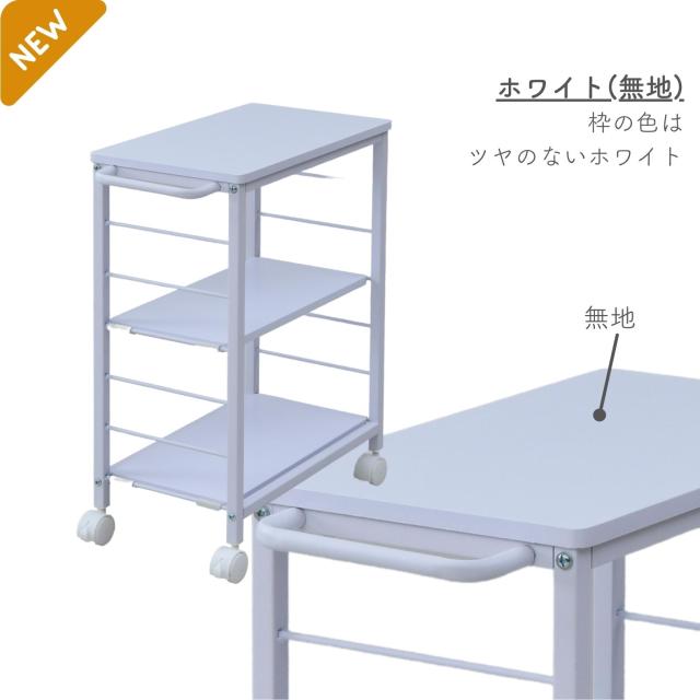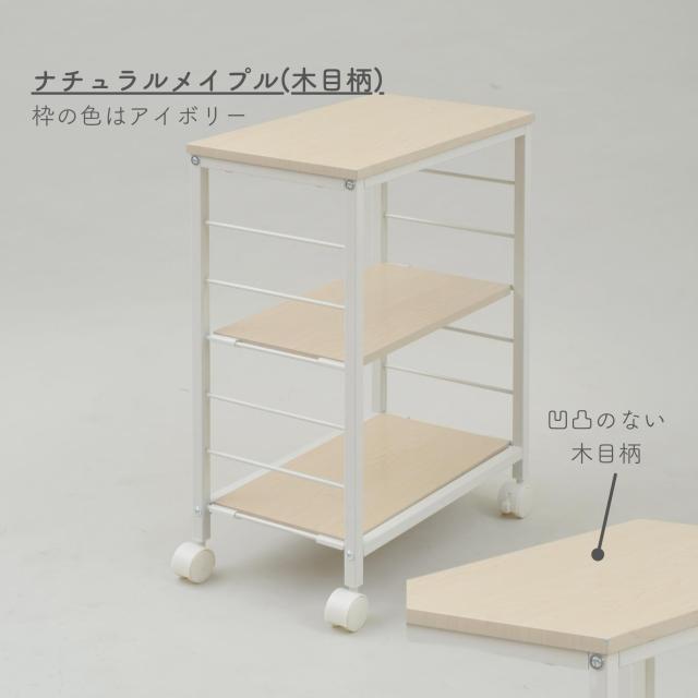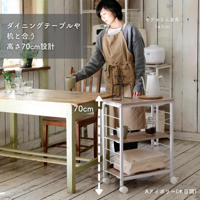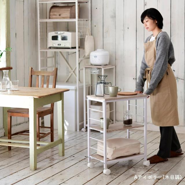 | 商品説明 | ●キッチンやデスクサイドで活躍するマルチワゴン ●天板はダイニングや机に合う高さ7085c、配膳や作業台として活躍 ●棚板2枚は可動式で高さを選択可能:約9cm間隔、5段階で調節 ●収納部内寸:幅24 奥行44 高さ56cm ●天板サイズ:幅30 奥行50cm ●棚板サイズ:幅24 奥行44cm ●天板耐荷重:20kg ●棚板耐荷重:15kg ●全体耐荷重:50kg ●キャスター4個(うちストッパー付2個) ※2022年2月13日より、新色追加しています。 |
