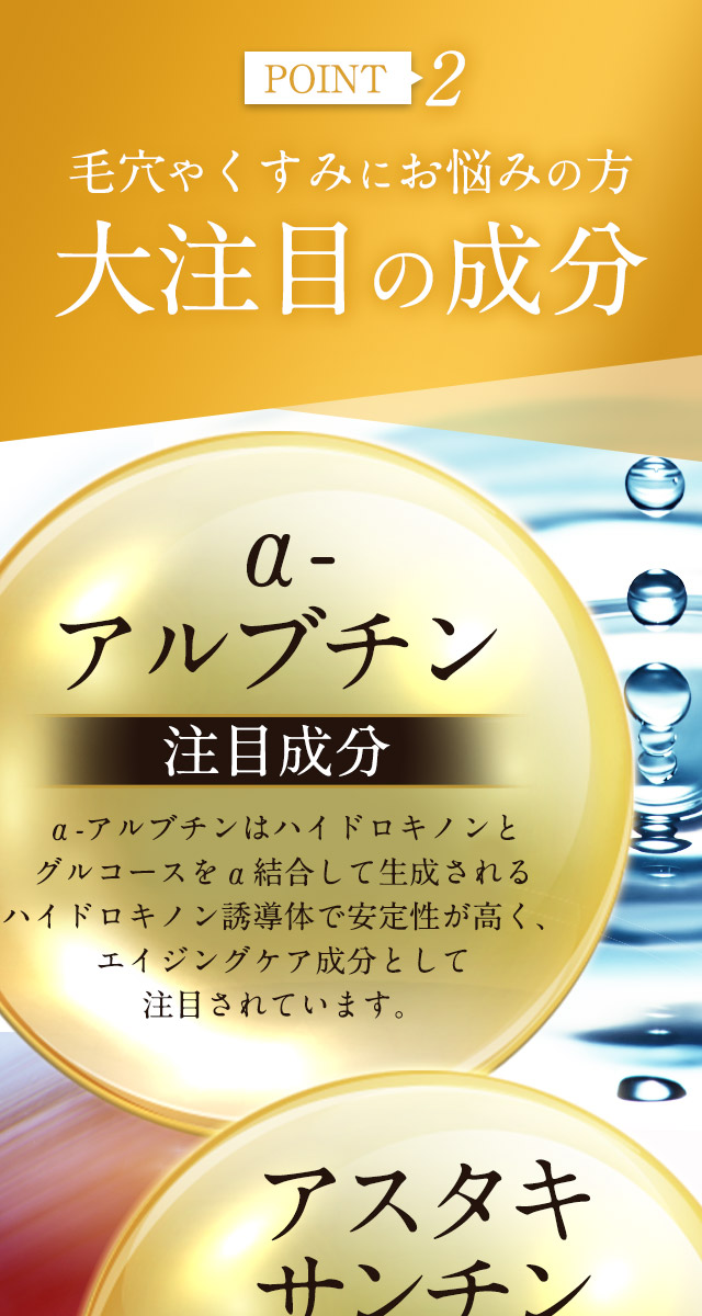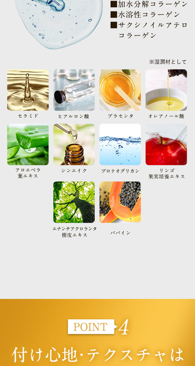 水, DPG, ベンチレングリコール, グリセリン, 温泉水, パルミチン酸アスコルビルリン酸3Na, セレブロシド, リン酸アスコルビルMg, アスコルビルグルコシド, ヒアルン酸Na, 加水分解コラーゲン, 水溶性コラーゲン, サクシノイルアテロコラーゲン, アロエベラ葉エキス, α-アルブチン, アスタキサンチン, リンゴ果実培養細胞エキス, プラセンタエキス, 水溶性プロテオグリカン, エナンチアクロランタ樹皮エキス, オレアノール酸, パパイン, パルミトイルペンタペプチド-4, アセチルヘキサペプチド-8, ジ酢酸ジペプチドジアミノブチロイルベンジルアミド, パルミトイルテトラペプチド-7, パルミトイルトリペプチド-1, クリシン, N-ヒドロキシコハク酸イミド, BG, エタノール, トリ(カプリル酸/カプリン酸)グリセリル, デキストリン, レシチン, ラウリン酸ポリグリセリル-10, PEG-20ソルビタンココエート, ポリソルベ-ト20, ステアレス-20, キサンタンガム, カルボマー, クエン酸, クエン酸Na, フェノキシエタノール