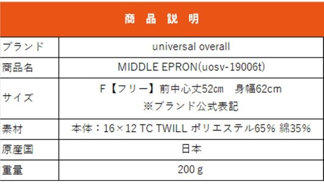 ミドルエプロン ユニバーサルオーバーオール UOSV-19006T 男女兼用 メンズ レディース ガーデニング 飲食店 カフェ 美容師 花屋 キッチン【送料無料】【即日発送】